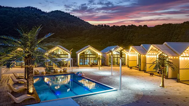 글램핑 시설과 더불어 스파, 실외 수영장, 사우나를 이용할 수 있음. 공용 주방과 바비큐 시설을 갖추고 있으며 전 구역 무료 와이파이를 제공함. 단지 내 편의점이 위치해 있으나 반려동물 동반은 불가함.