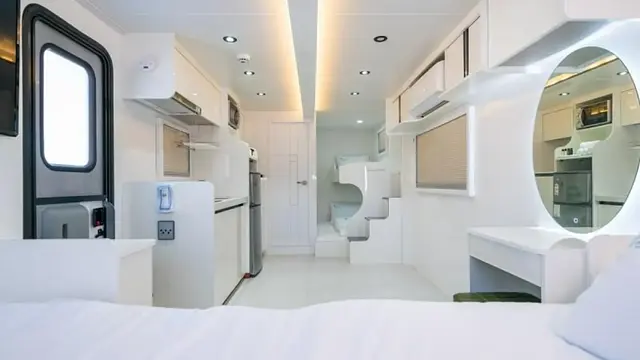 펜션 같은 실내 환경 - 겉모습은 글램핑, 내부는 온돌 및 냉난방기 갖춘 원룸형.