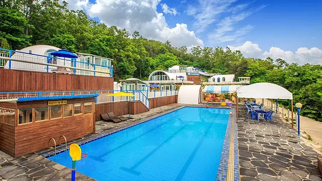대형 광천수 수영장 - 크고 깨끗한 수질을 자랑하며, 비 올 때도 이용 가능한 시설 완비