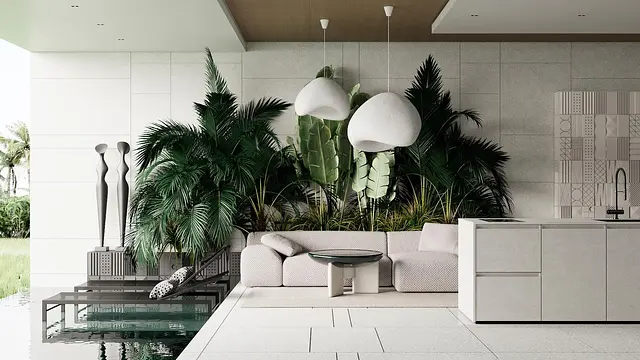 반 개방형 욕실 - 욕실이 외부와 가깝고 반 개방형 구조로, 프라이버시 및 안전에 대한 고려 필요
