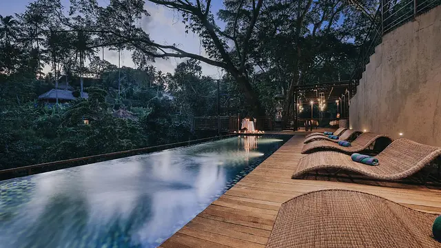 우붓 정글의 현장감 - 객실 내에서 폭포와 정글을 직접 조망할 수 있어 자연 속에 머무는 경험을 제공함