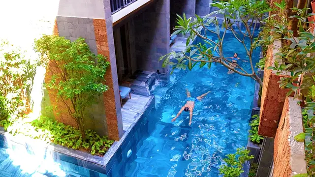 수영장 이용 시간 제약 - 수영장을 둘러싼 구조로 인해 저녁 8시 이후 이용이 제한됨.