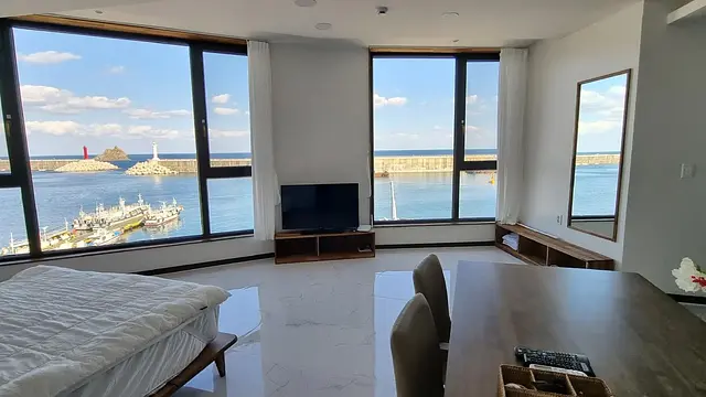 탁 트인 바다 전망 - 객실 대형 통창으로 저동항 전경과 인상적인 일출을 편안하게 감상 가능.