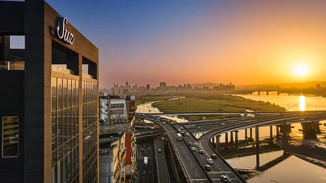 탁 트인 리버뷰 - 바닥부터 천장까지 이어진 전면 통창을 통해 타이베이의 강 전경을 실내에서 감상함