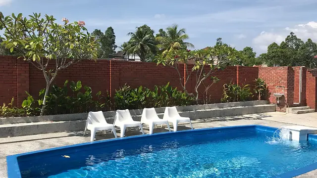 시설 노후화 및 파손 주의 - 수영장 타일 파손으로 부상 위험이 있고, 옷장 문 파손, 베개 커버 미교체 등 전반적인 시설 관리가 부족함